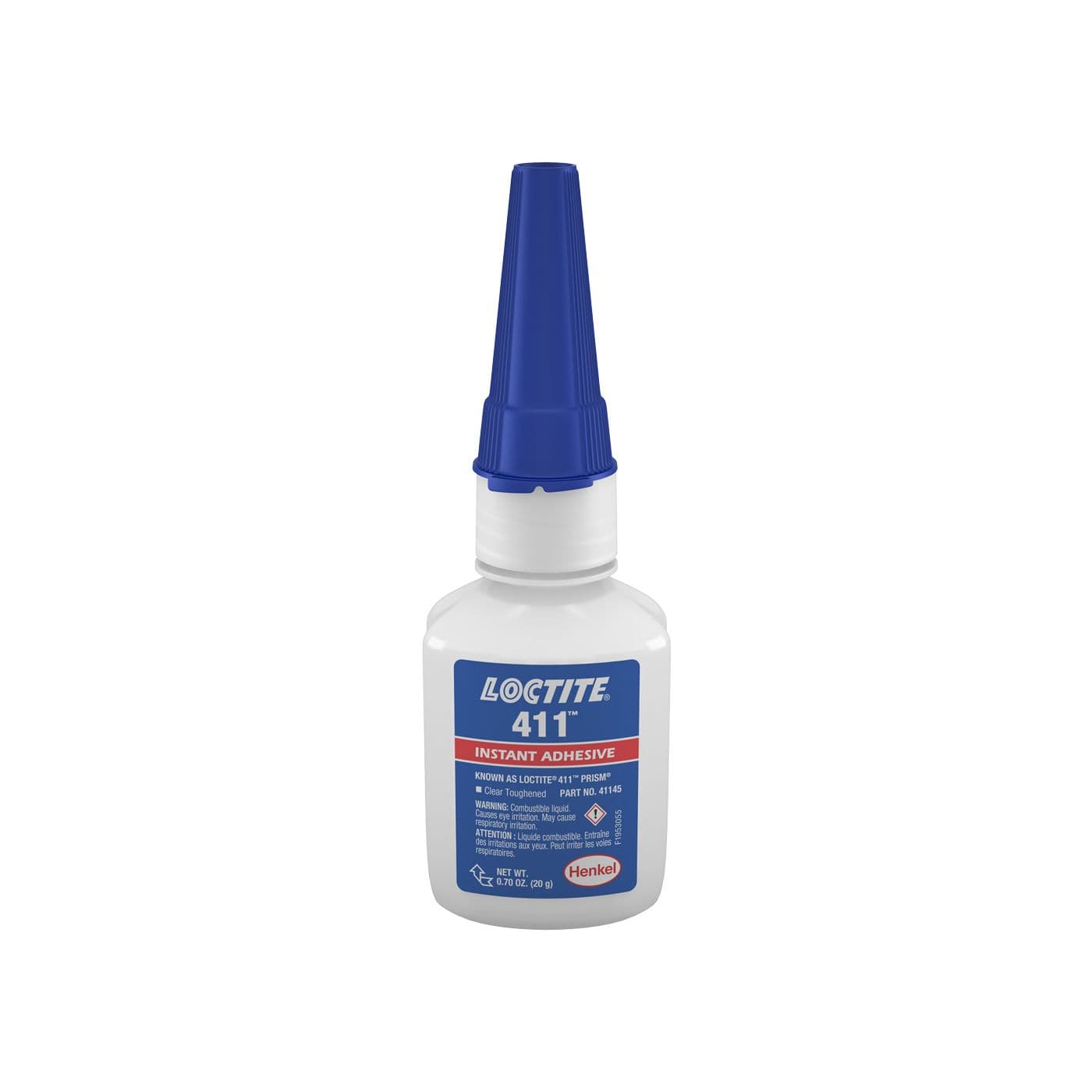 LOCTITEMD 411 est un gel adhésif à base de cyanoacrylate d’éthyle, transparent à légèrement trouble, à haute viscosité. Cet adhésif instantané à usage général, qui comble les interstices, convient pour coller le caoutchouc, les plastiques et les métaux. Il présente une excellente résistance au pelage et une résistance accrue à la chaleur. Le temps de fixation est de quelques secondes, et le durcissement complet est atteint en 24 heures dans des conditions normales d’humidité ambiante.