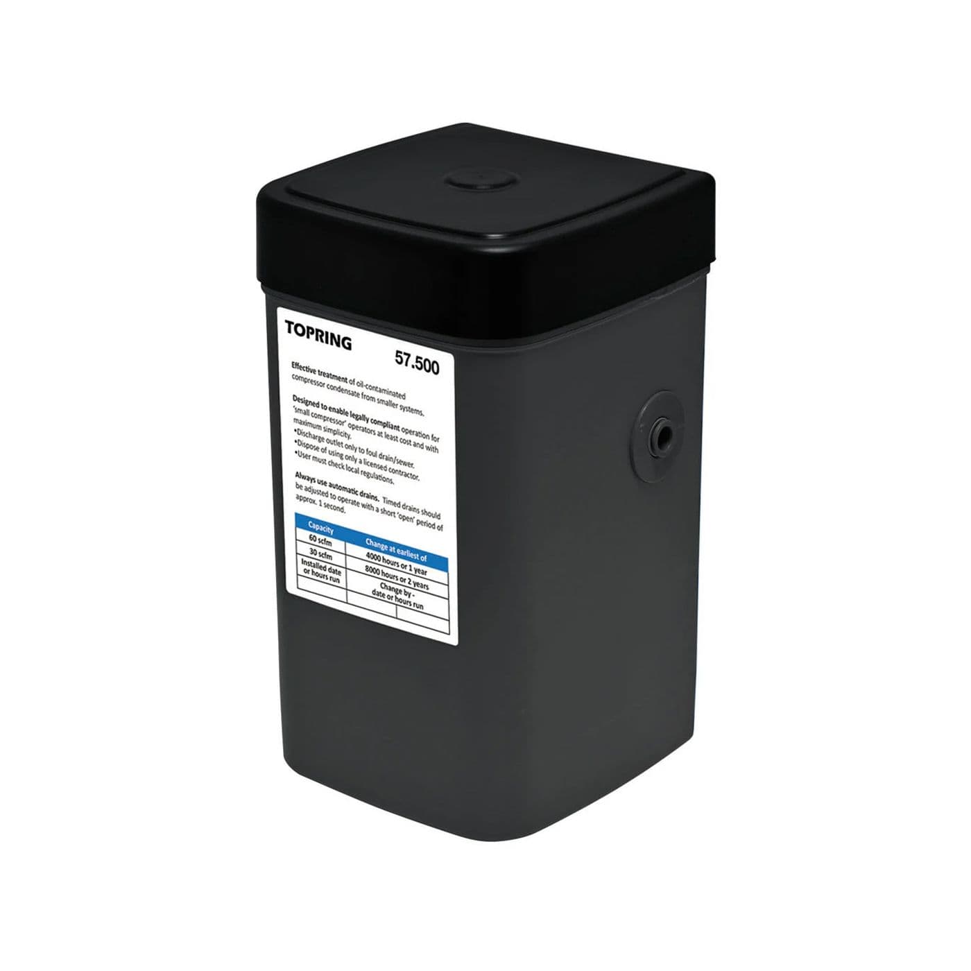 Doté d’une technologie de filtration avancée avec polypropylène adsorbant, ce séparateur eau-huile sépare pratiquement tout type de condensat rejeté par un purgeur. Aucun besoin de réservoir de décantation ou de réservoir d’entreposage et surtout aucun entretien nécessaire. Une façon simple et efficace de se débarrasser des condensats en respectant les normes environnementales en vigueur. Très haut niveau de performance et faibles frais d’exploitation. Fiable, léger et propre. Facile à manipuler, à installer et à démonter. Aucun prétrempage requis permettant d’économiser du temps lors de l’installation et l’entretien. Corps moulé monobloc de haute qualité. Connexions pour entrées multiples pour plusieurs points de purge. Parfait pour des installations avec applications portatives pour espace de plancher restreint, avec tout type de compresseur à huile ou de purgeur et mélanges émulsionnés. Idéal pour satisfaire les règlementations de décharge EPA.