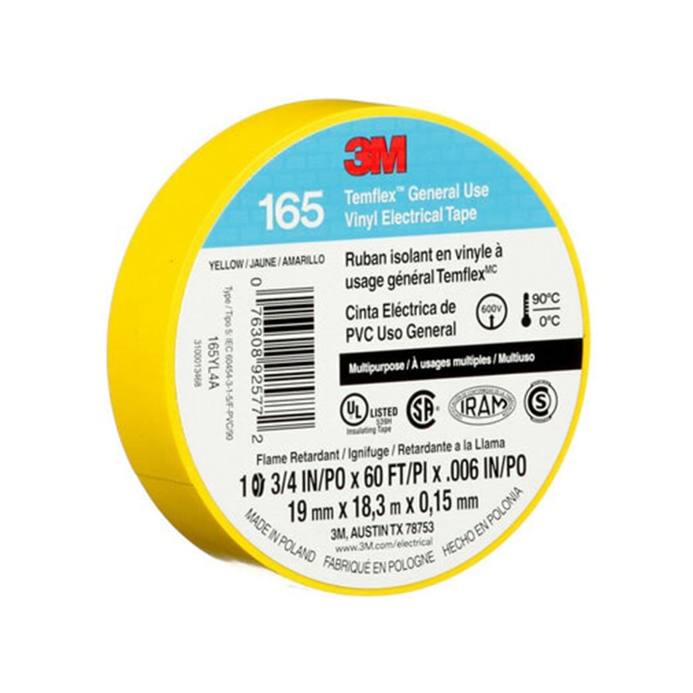 Ruban isolant en vinyle à usage général 165 TemflexMC, jaune, 19 mm x 18 m x 0,15 mm