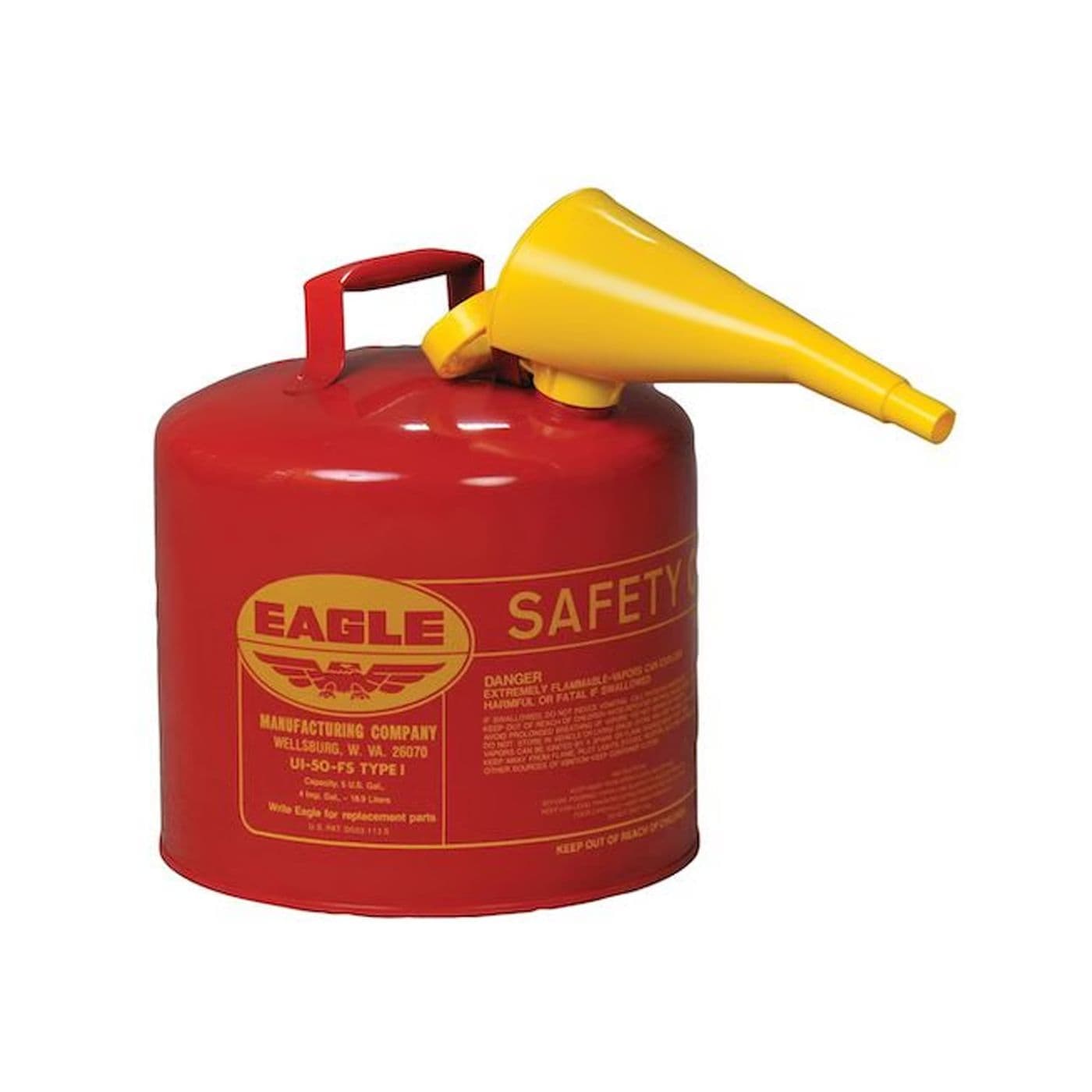 Le bidon de sécurité en acier de type I pour produits inflammables Eagle Red (modèle UI50FS), robuste et fiable, pèse 3,2 kg (7 lb) lorsqu’il est vide et environ 17 kg (37 lb) lorsqu’il est plein, ce qui le rend idéal pour les ravitaillements rapides. L’orifice de remplissage a un diamètre intérieur de 4,19 cm et l’entonnoir fourni permet d’éviter les déversements et les éclaboussures lors du remplissage de petits réservoirs. Et comme ce bidon mesure 34,3 cm de haut et 31,8 cm de diamètre extérieur, il est facile à ranger dans votre armoire de sécurité Eagle.