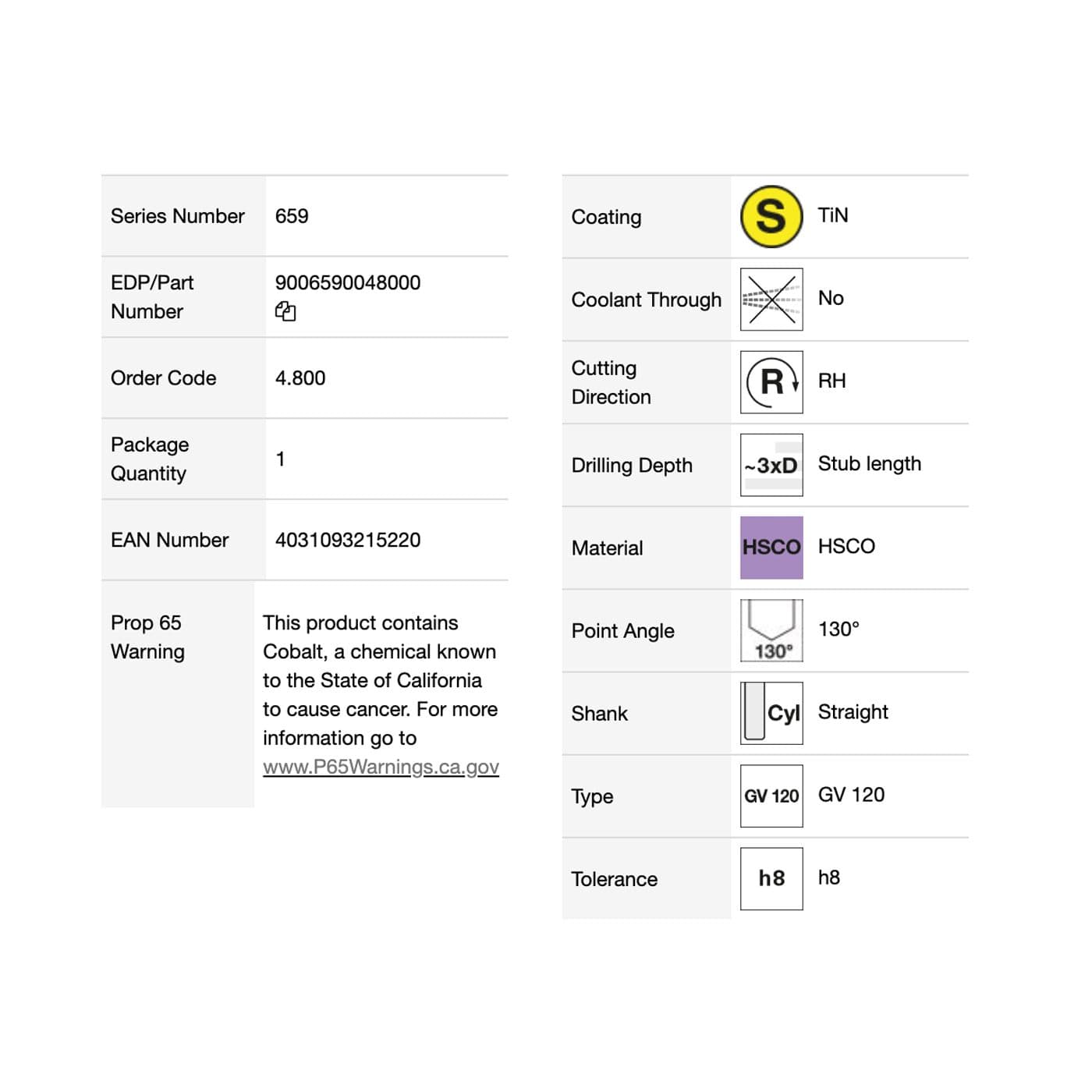 Foret court, HSCO, #12, goujure 26 mm long., 62 mm long., pointe 130°