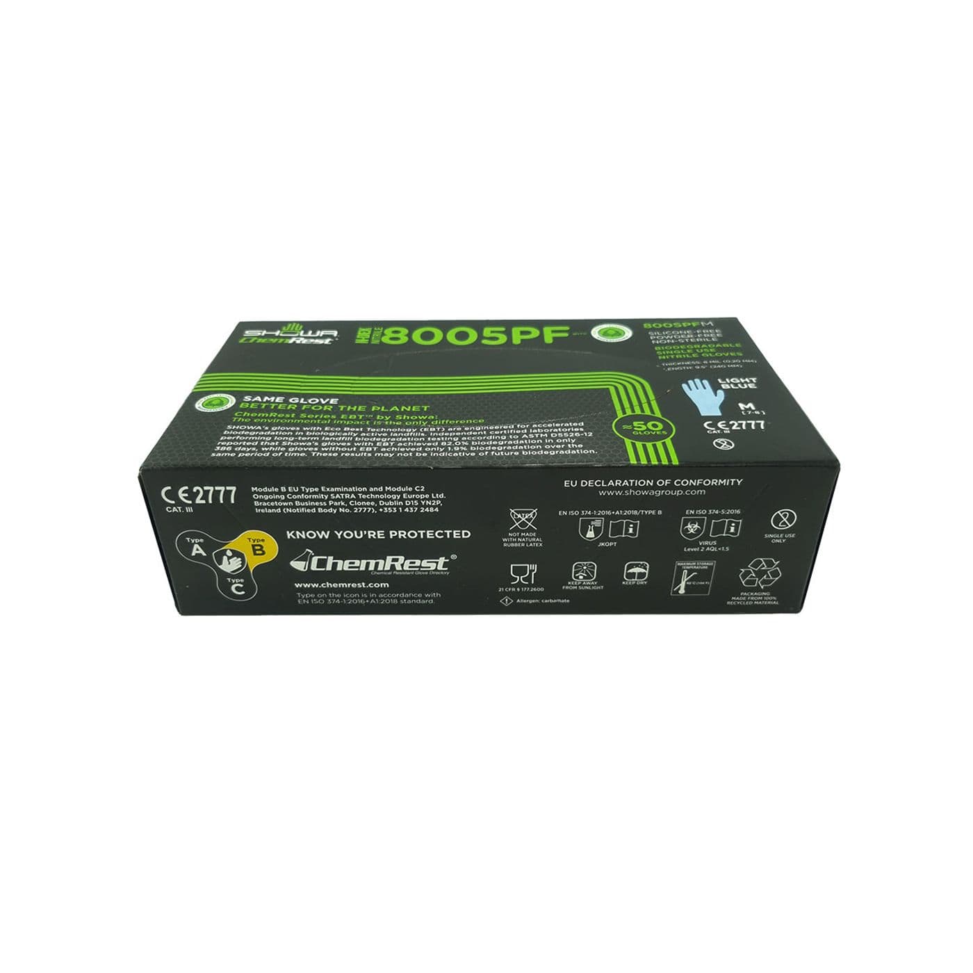Avec la technologie EBT, le gant SHOWA 8005PF est conçu pour les activités exigeant un haut niveau de protection, tout en offrant confort et sensibilité tactile. Grâce à l’Eco Best TechnologyMD (EBT) révolutionnaire de SHOWA, ces gants sont conçus pour accélérer leur biodégradation dans les sites d’enfouissement biologiquement actifs. Le poignet empêche la pénétration de la poussière et permet de facilement retirer le gant en cas de perforation. Ambidextre, le modèle 8005PF offre une sensation « seconde peau » pour moins de fatigue lors de son utilisation prolongée.